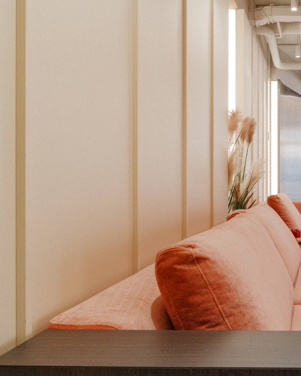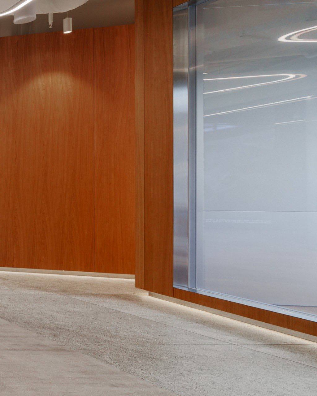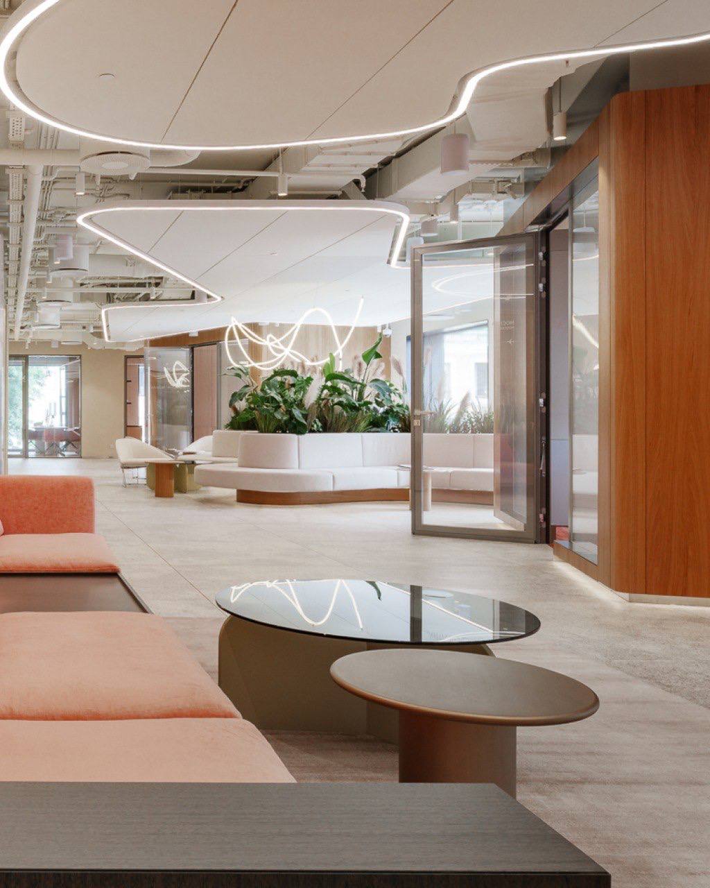 Особое внимание было уделено созданию атмосферы «воздушного потока» — мягкие изгибы, текучие линии, светлые оттенки, премиальные материалы и технологичные зоны делают офис не просто функциональным, а вдохновляющим.