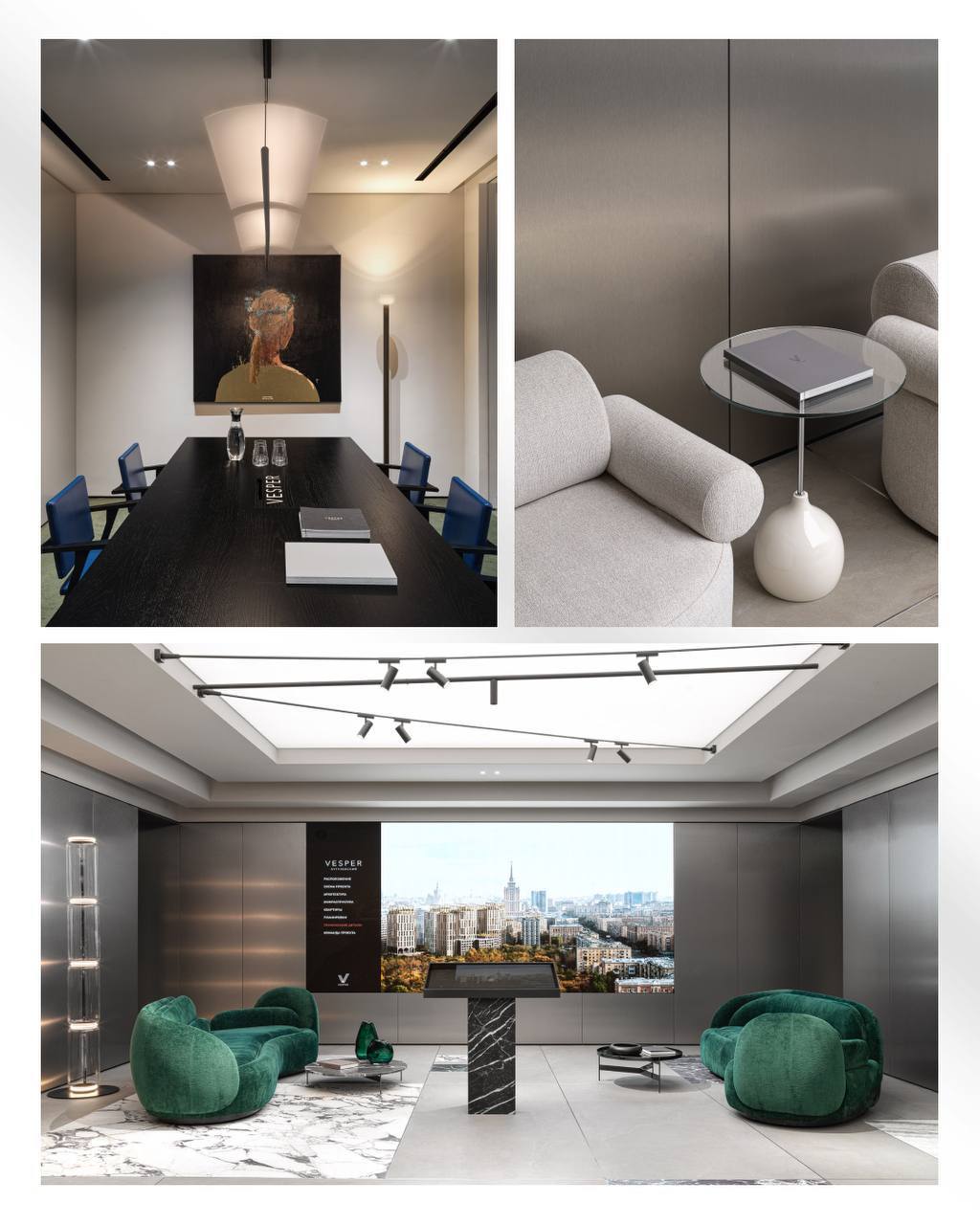 The new Vesper sales house is a single space for all the developer’s projects in the center of Moscow. A modern minimalist interior with references to iconic aesthetics and thoughtful lighting.